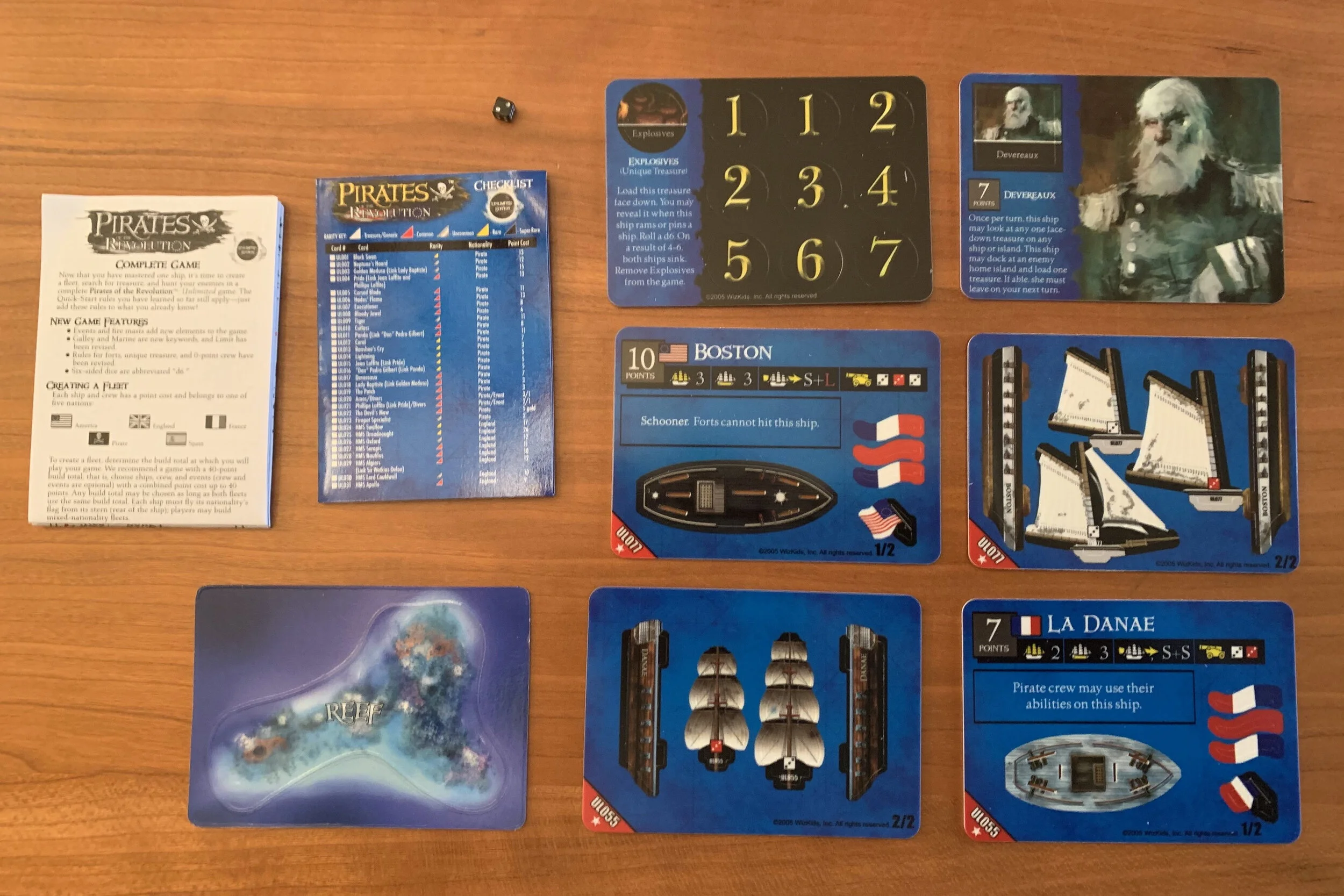 The contents of a single Pirates of the Revolution pack displayed on a table.